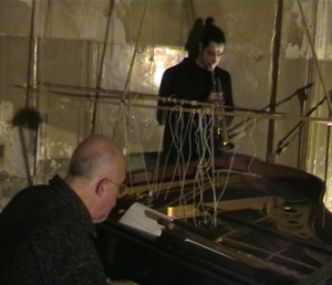 2002 La ripresa di contatti con musicisti degli anni ’70 riapre anche la collaborazione con Marcello Bizzarri, valente polistrumentista a fiato, che ha ideato nell’occasione una grande trilogia installativa-psicoacustica, Resonance, tesa a valorizzare alcuni particolari luoghi del territorio di Spoleto. L’organizzazione interna di ogni singola parte di questo ciclo, progettata come una struttura musicale aperta e modulare, prevede anche alcune parti volutamente espanse temporalmente, 8 ore per Resonance I e 12 ore per Praeludium, prima parte di quattro di Resonance II. Il 30 agosto con una formazione di cinque musicisti tutti polistrumentisti Resonance I è stato realizzato in prima assoluta a Spoleto nel Chiostro di S. Niccolò in uno scenario che ha visto riempirsi l’abside di oltre un centinaio di strumenti tra quelli tradizionali e quelli autocostruiti. La prova di Resonance consolida e riapre così nuovamente la parentesi strumentale mai completamente assopita, sia quella relativa agli strumenti a fiato autocostruiti, che quella improvvisativa pianistica, infatti Resonance I prevede, dopo un silenzio assoluto di quasi 15 anni dalle scene musicali estemporanee, nella seconda sezione notturna, ben quasi un’ora dedicata al piano solo.